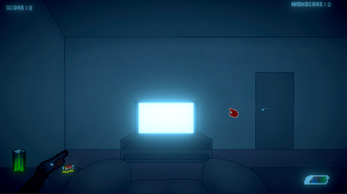In the living room, reload the shotgun by clicking on it and regain your sanity by drinking the Legally Distinct Energy Drink as it slowly seeps away.